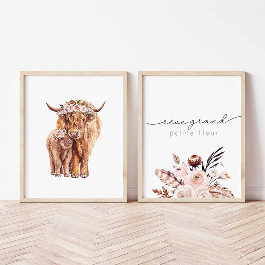 Ensemble de deux affiches numériques | Vaches Highland et Fleurs Latté