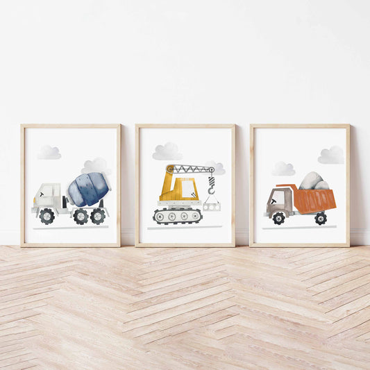 Ensemble de trois affiches numériques personnalisées | Machinerie Vroom bleu et rouille avec prénom