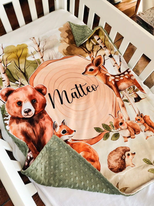 Couverture en minky personnalisée | Forêt Enchantée avec rondin et prénom