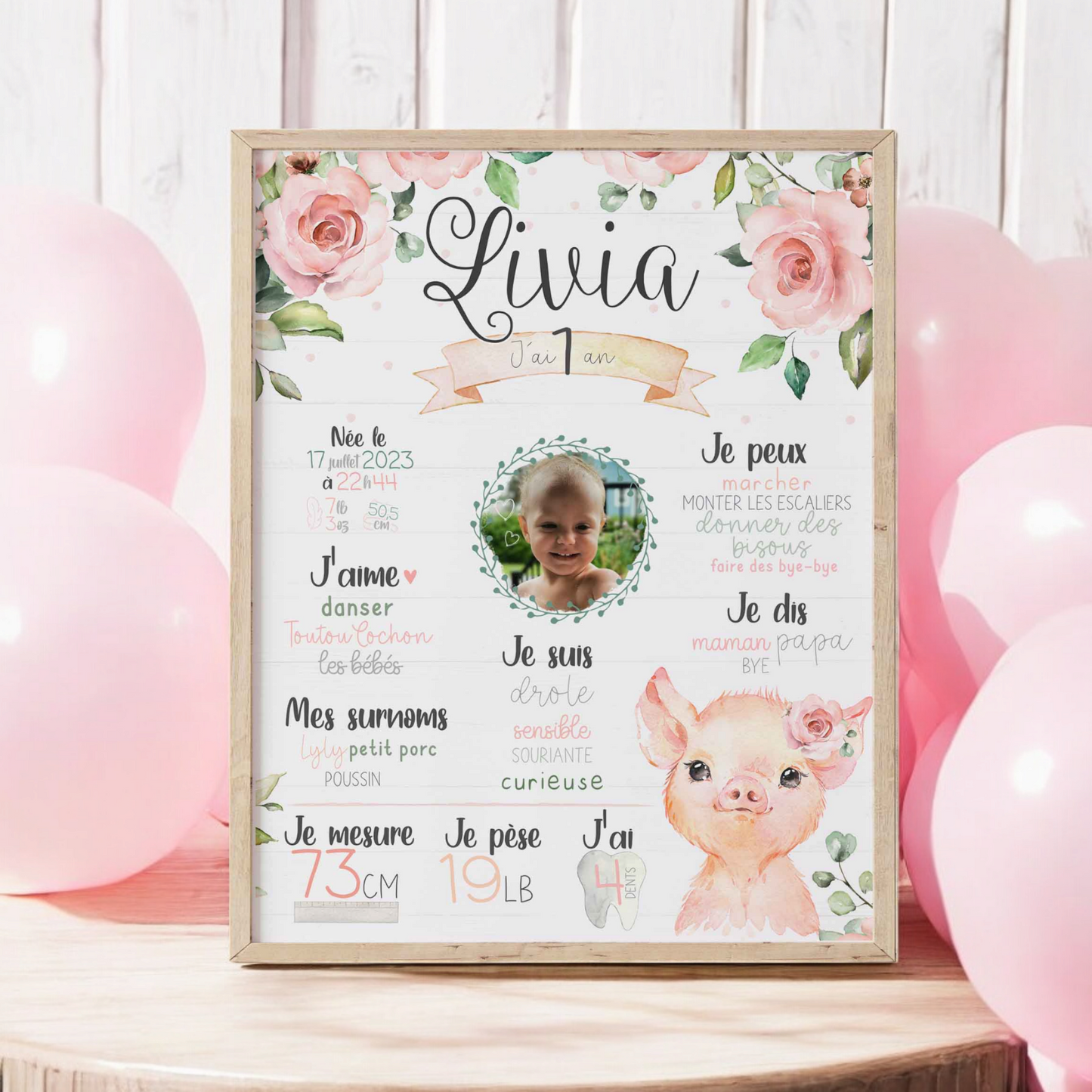 Cette jolie affiche d'anniversaire est l'accessoire parfait pour célébrer la première année de votre bébé! Avec un adorable cochon et des roses du printemps, elle ajoutera une touche de fraîcheur et de bonheur à votre décoration. Idéal pour une ambiance joyeuse!