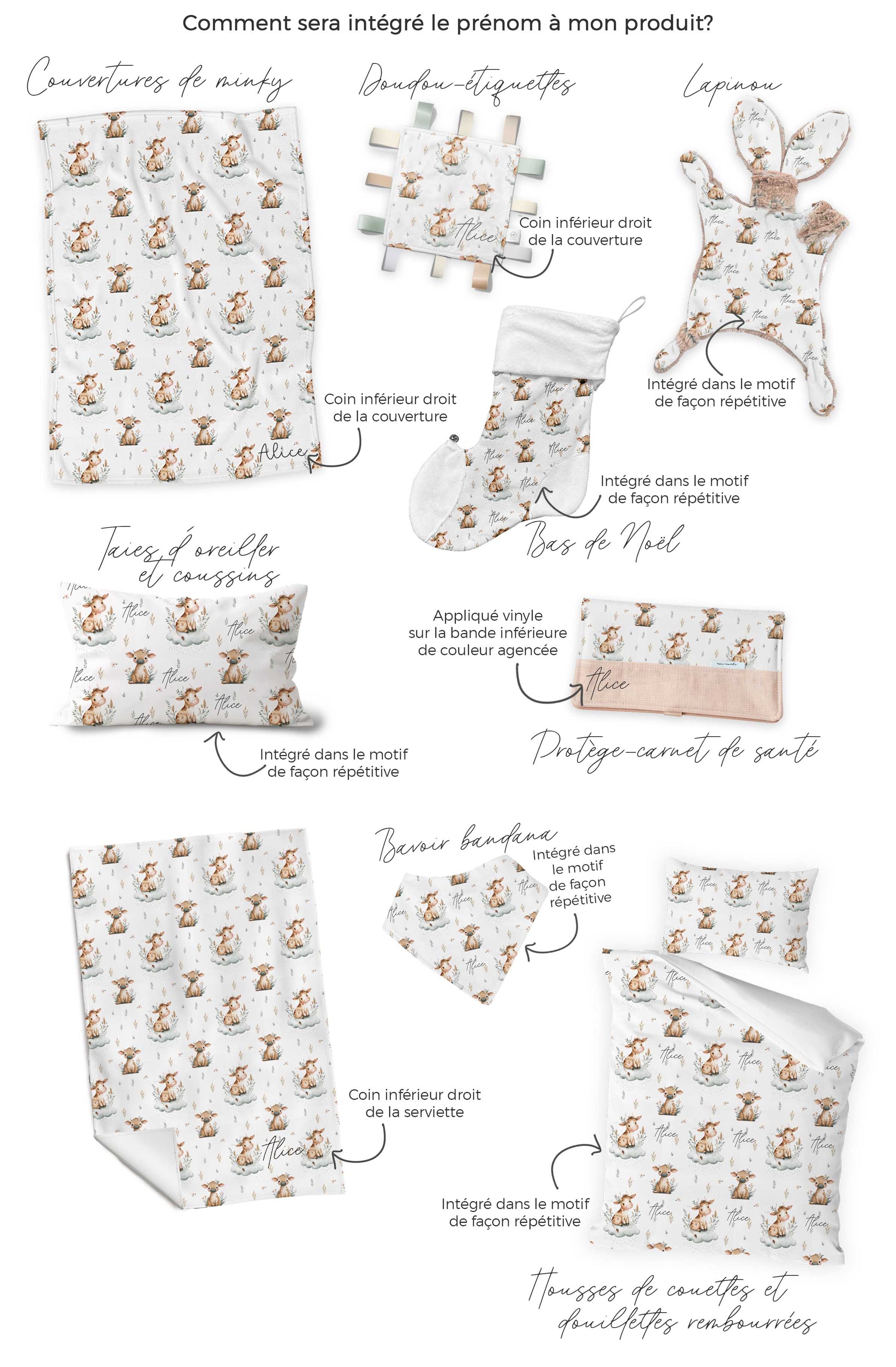Pour savoir comment sera intégré le prénom de l'enfant sur le produit, référez-vous aux images dans la fiche produit.