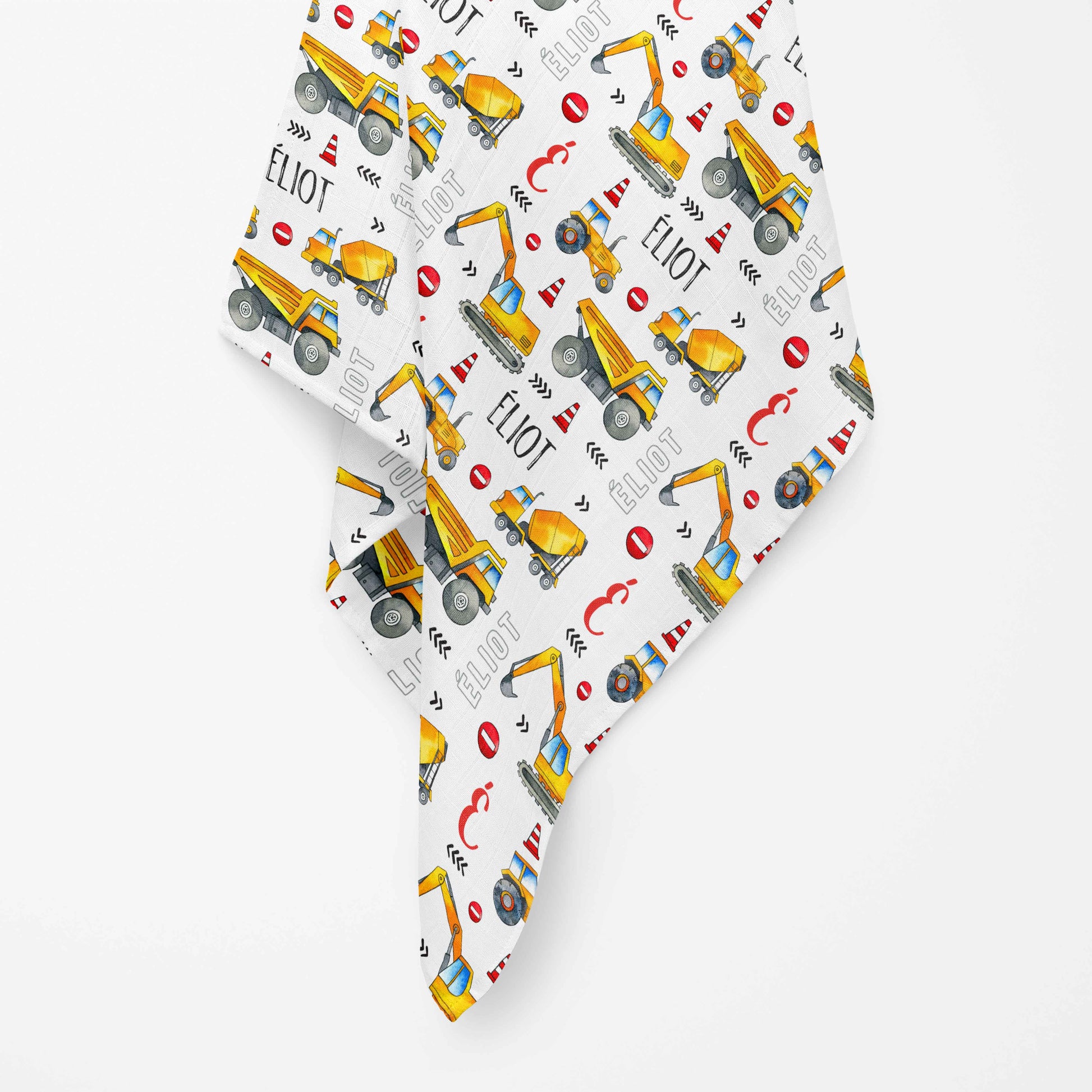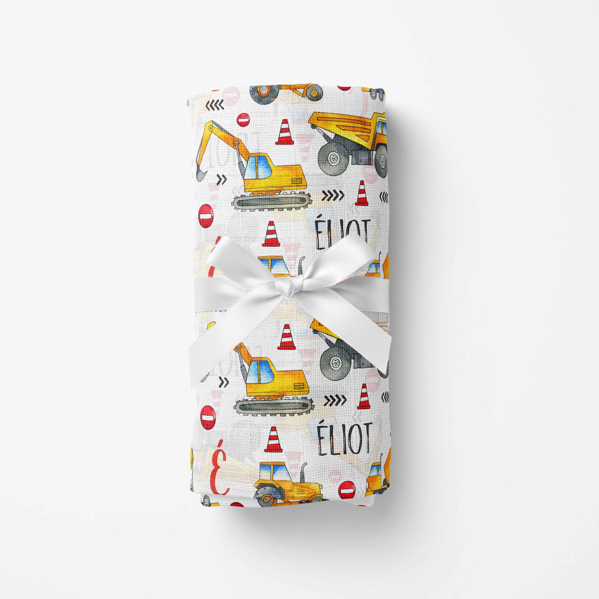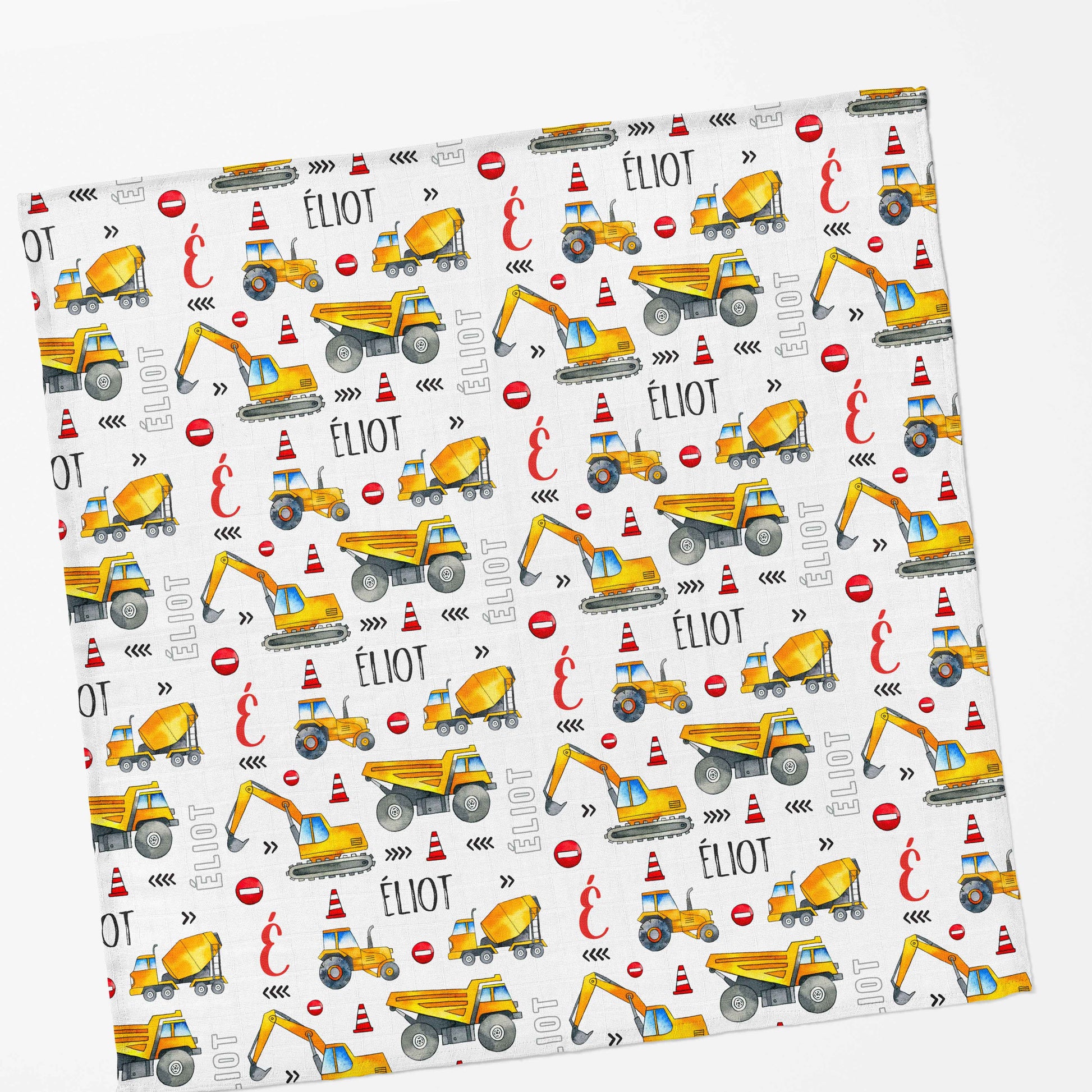 Couverture en mousseline de bambou | Construction aquarelle jaune prénom répétitif