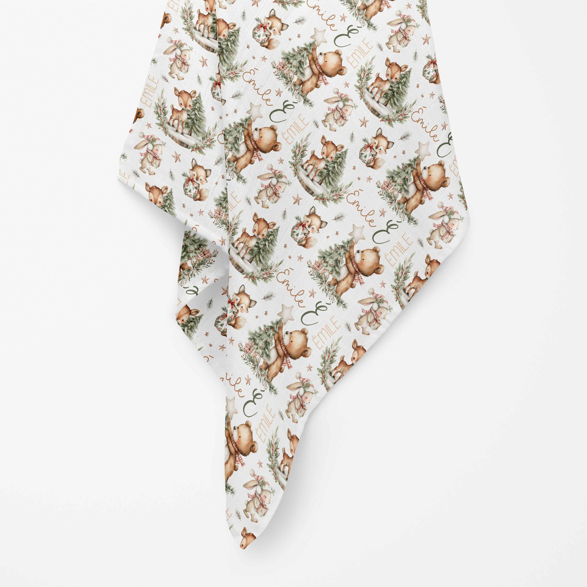 Couverture en mousseline de bambou | Ourson et sapin prénom répétitif