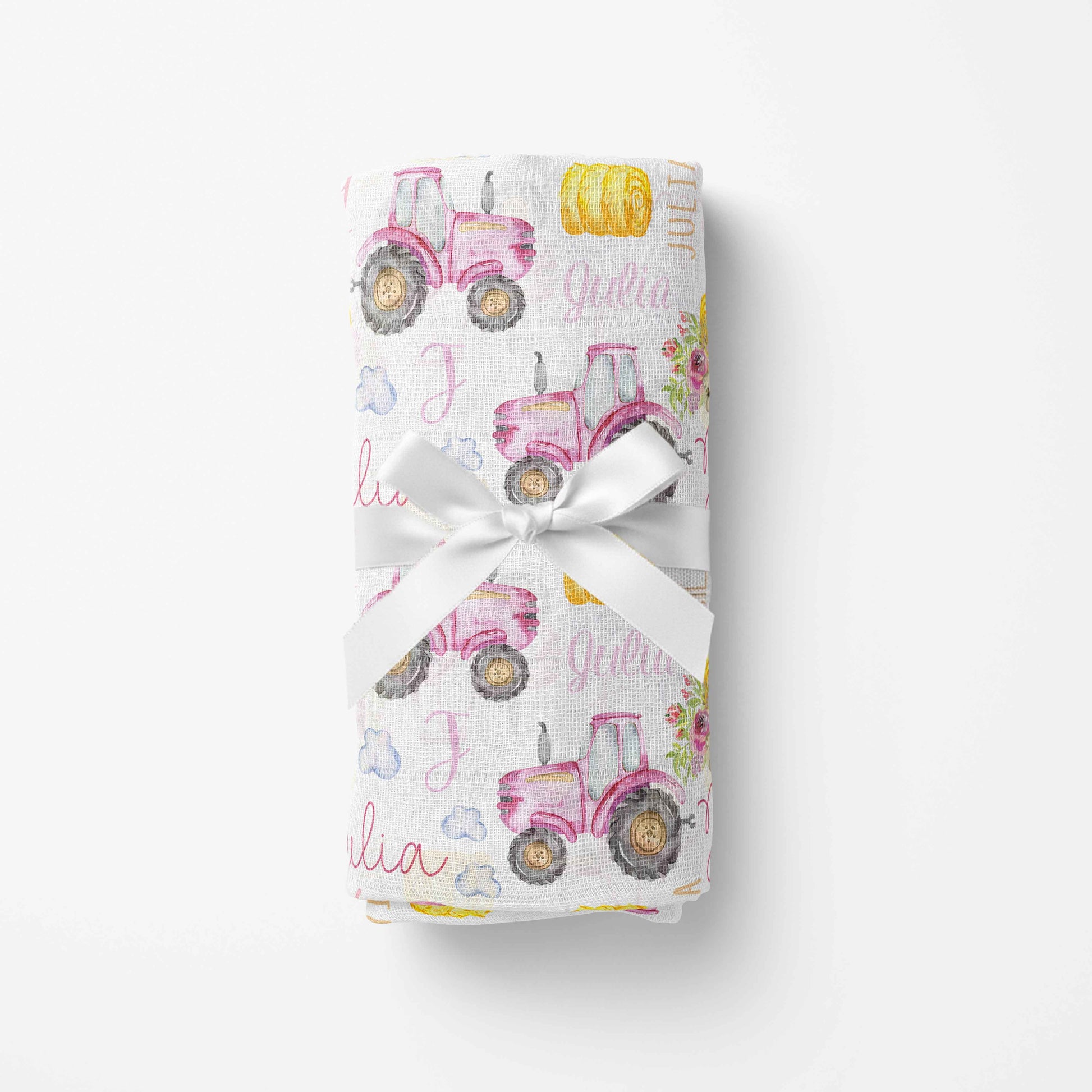 Cette couverture en mousseline de bambou est ornée de délicats tracteurs roses. Le tissu en mousseline ferme est parfait pour garder votre bébé confortable et au chaud, tandis que le prénom répétitif ajoute une touche personnelle. Offrez à votre bébé le meilleur en matière de douceur avec cette couverture unique!
