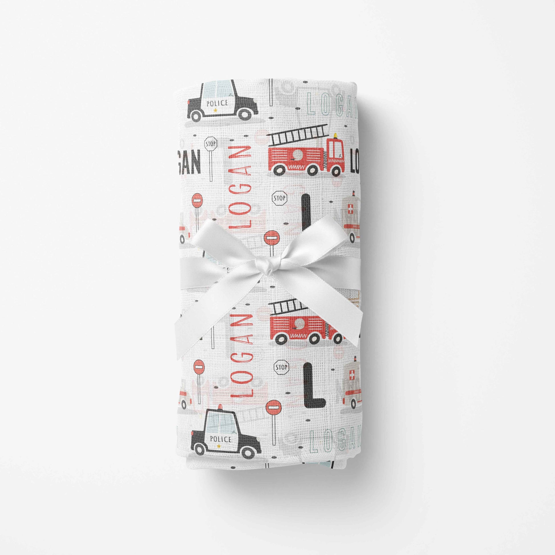 Couverture en mousseline de bambou | Véhicules d'urgence prénom répétitif
