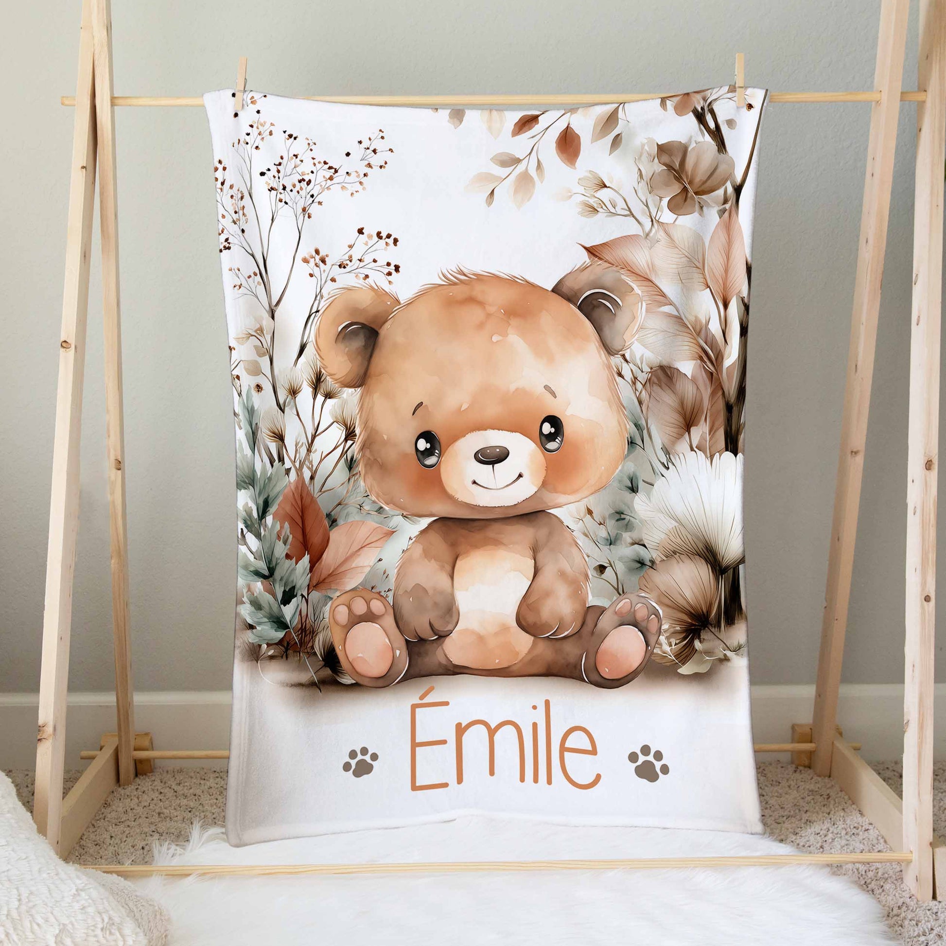 Enveloppez votre enfant de douceur grâce à cette couverture personnalisée décorée d’un charmant petit ours. Avec ses teintes automnales chaleureuses, elle ajoute une touche de confort et de câlins à la chambre de bébé. Un cadeau spécial et réconfortant, idéal pour les instants de repos et de tendresse.